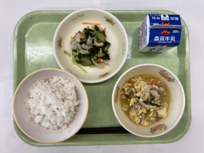 親子煮、酢味噌和え、麦ご飯、牛乳