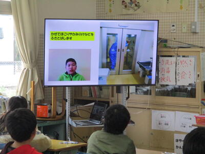 木倉小では給食記念週間の取組の一環としてリモートによる給食集会を行いました。大量の食材を大きな鍋でダイナミックに調理する様子やできあがった給食が多くの方々の手を経て、自分たちに届くことなどが分かりやすく説明されました。