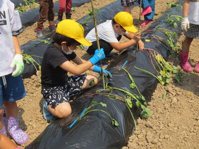 2日目は、教室横の学級園にシートをひき、種籾を丁寧に均等にまき、愛情を込めて土をかぶせる作業を行いました。これから毎日天気を見ながら水の調整を子どもたちがしていきます。