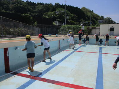 6月2日(木)に晴天の中でプール掃除がありました。1,2年生が1時間目にプールサイドの掃除をがんばりました。そして、2、3時間目に3年~6年の子ども達でプールの中やトイレなどの掃除をし、全児童で自分たちのプールをみんなできれいにしました。