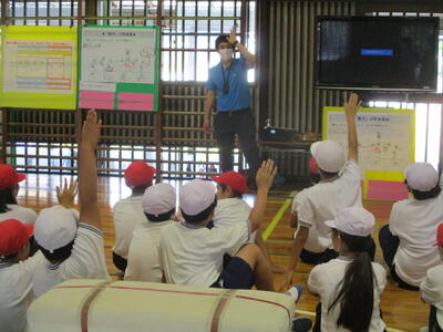 御船警察署の方を講師にお招きして、全児童を対象に、道路や横断歩道の歩き方や気をつけることなどを分かりやすく話していただきました。その後、3年生以上に自転車の安全な乗り方について講話をしてもらいました。