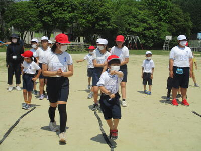 この日初めて参加する1年生には6年生がマンツーマンでペアになり、一生懸命に教えてくれました。1年生も笑顔いっぱい、汗をかいて楽しみました。2年生には5年生がペアになり、お兄さんお姉さんらしく張り切って教えていました。リズムジャンプの時間はみんな楽しみです。