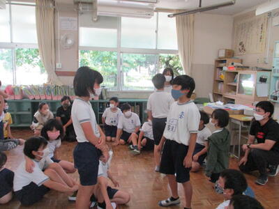 梅雨時期の昼休み、5年生は昼休みに楽しみながらお互いのことをさらに知り合う活動を通して、友達同士をつなぐことをねらってグループエンカウンターのクラス遊びをしました。