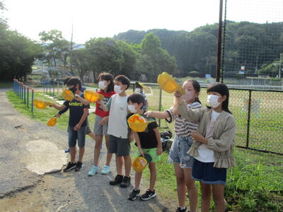1年から6年まで自分たちで時間を決めて、みんなで草を取っています。子ども達は「ちょボラボックス」と草取りかまをもち、グランドへ元気に行きます。みんなの力を合わせれば大きな力になるように、この1週間でグランドの草はずいぶん減りました。