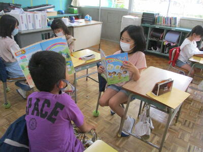 どんな色の虹にしたか、友達の紹介をしていきました。中には、自分の虹の絵を友達に見せながら色を指さし、「レッド」「パープル」・・・とクリアーボイスで紹介している子どももいました。聞いている子どももアイコンタクトで頷きながら聞いていました。