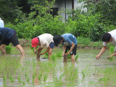 田植えが終わると、青々とした苗が風になびき、とても美しかったです。福島さんに改めてお礼をいい、笑顔で写真撮影をしました。学級委員の方を始め、保護者の皆様、ありがとうございました。