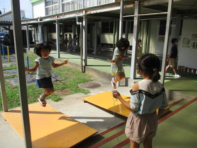 この日は晴天の中、リズムジャンプに取り組みました。リスムジャンプのロープを伸ばし、軽快なBGMに乗って様々な跳び方で跳んでいきました。
