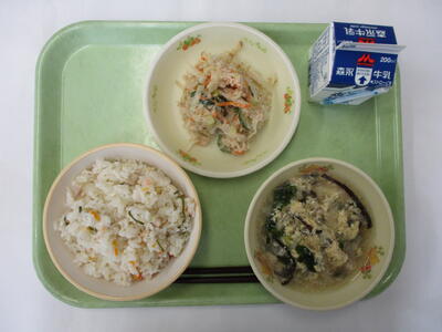 今日は7種類の具材を入れた具だくさん汁です。具材をたくさん入れるといろいろな栄養もとれて味もよくなり、おいしさが増します。また、ちくわの磯辺揚げは青のりを入れた衣を付けて揚げたものですが、磯の香りがして食欲が増します。サラダのカレー味もほどよい辛味と香りで食欲が増しますね。特に食欲がない日にはいろいろと味付けを工夫してみましょう。