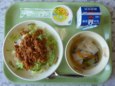 タコライス、ワンタンスープ、レモンゼリー、牛乳