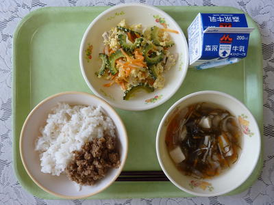 もずくスープ、ゴーヤチャンプルー、肉味噌、麦ご飯、牛乳