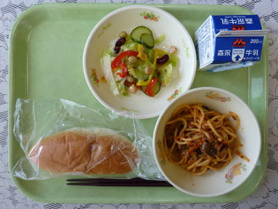 なすのミートスパゲティー、イタリアンサラダ、ミルクパン、牛乳