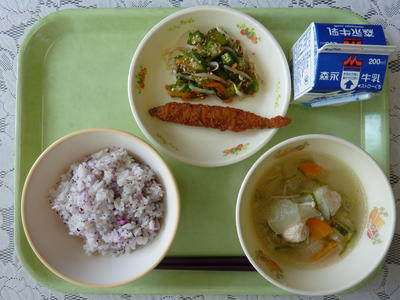 冬瓜のスープ、ししゃもフライ、おくらのおかか和え、ゆかりごはん、牛乳