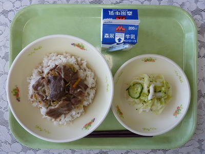 和牛を使った牛丼、キャベツとかまぼこの梅和え、牛乳
