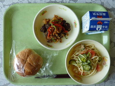 冷製スパゲティ、レバーのカシュナッツ炒め、パインパン、牛乳