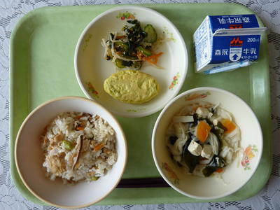 南関あげの混ぜご飯、ふしそうめん汁、ほうれん草のだし巻き卵、御船川のナムル、牛乳