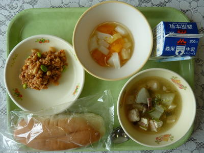 新じゃがいものそぼろ煮、ごま酢和え、納豆、麦ご飯、牛乳