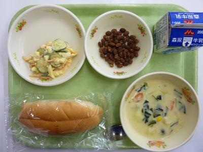 小松菜のクリームスープ、エッグサンド、大豆のチョコりんかけ、牛乳