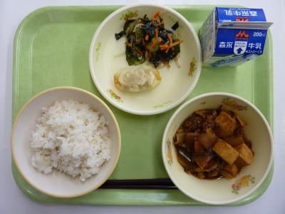 みふねがわのナムル、チャージャン豆腐、焼き餃子、麦ご飯、牛乳