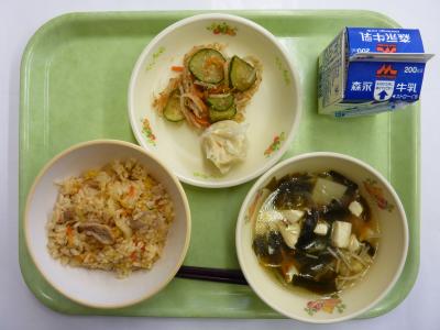 キムチご飯、豆腐焼売、わかめスープ、牛乳
