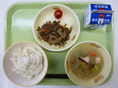 馬肉のきんぴら、さつま汁、ミニトマト、麦ご飯、牛乳
