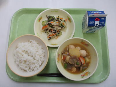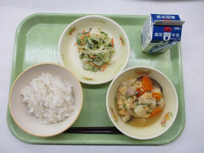 麦ごはん、牛乳、高野豆腐の卵とじ、切干大根の酢の物