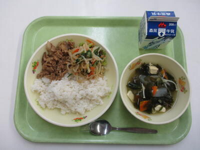 麦ごはん、牛乳、中華風かき玉スープ、焼き肉風いため