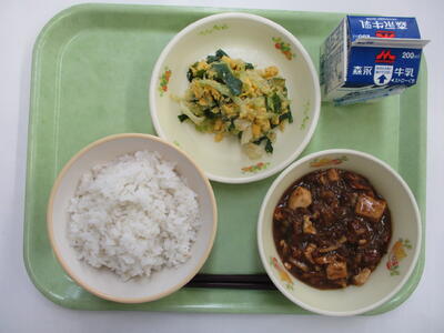 麦ごはん、牛乳、マーボー豆腐、にらと卵のサラダ