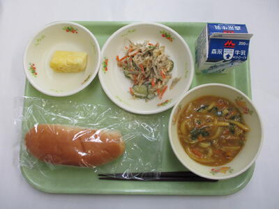 丸パン、牛乳、野菜のスープ煮、タンドリーチキン、ごぼうのサラダ