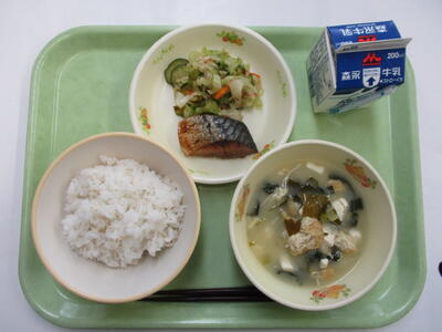 麦ごはん、牛乳、なめこ汁、さばの塩焼き、五目きんぴら