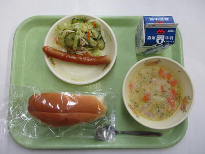 セルフホットドッグ、牛乳、白いんげんの豆の豆乳スープ、ウインナー、キャベツのマスタードサラダ