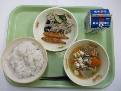 麦ごはん、牛乳、けんちん汁、春雨の酢の物、きびなごのごまフライ