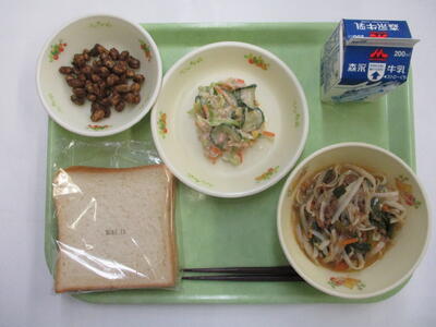 麦ごはん、牛乳、大豆の磯煮、わかめといかの酢の物、ちりめんナッツ