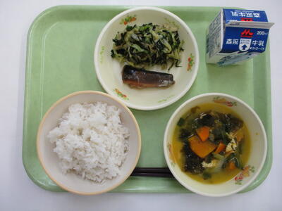 麦ごはん、牛乳、かぼちゃとニラの味噌汁、いわしの梅煮、小松菜の磯あえ