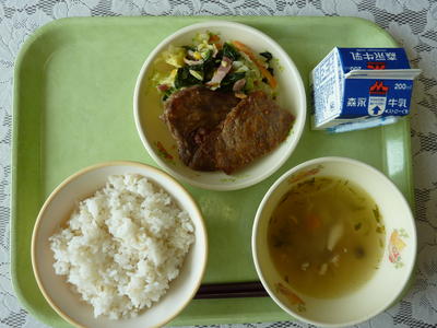 ビーフステーキ、コンソメスープ、3色炒め、麦ご飯、牛乳