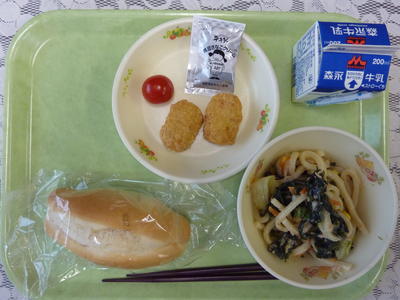 サラダうどん、チキンナゲット、ソフトフランスパン、黒豆きなこクリーム、ミニトマト、牛乳