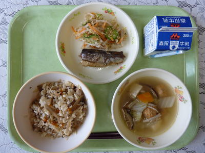 きんぴらご飯、つみれ汁、いわしの甘露煮、もやしのごま和え、牛乳