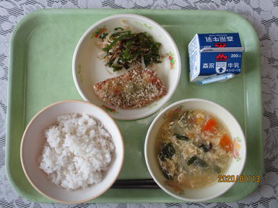 ホキの天玉揚げ、ピーマンの昆布和え、卵スープ、麦ご飯、牛乳