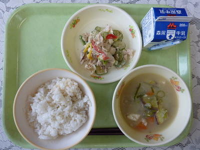 冷しゃぶサラダ、さつま汁、ひじきの豆腐あげ、麦ご飯、牛乳