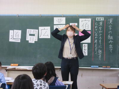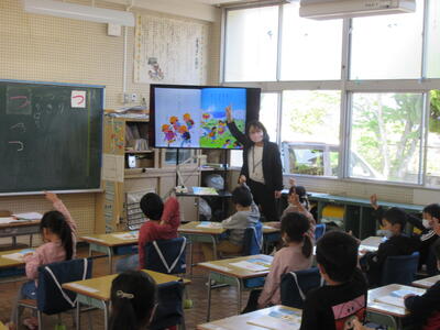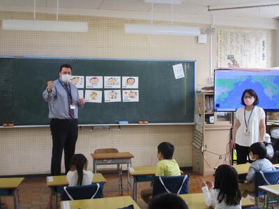 今日は初めての外国語活動がありました。ALTのクリス先生と担任の先生方と一緒に楽しく英語で遊びました。御船町は1年生から外国語活動の授業があります。