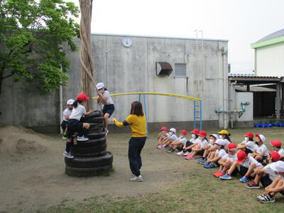 担任の先生がタイヤタワーの安全な使い方の指導をきちんと行い、いよいよ2年生が初めてタイヤタワーで回りました。ロープにしっかりつかまり、ももでロープをしっかりはさんで、笑顔いっぱいにタイヤタワー遊びを楽しんでいました。