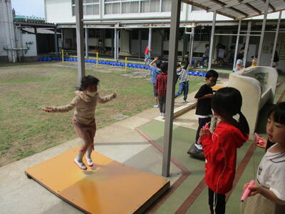1年、2年の教室前の中庭は、1、2年にとってとても大切な場所です。休み時間になるとジャンプボードで飛び跳ねたり、バランスボードでバランスを取り合ったりしています。その中でタイヤタワーだけは安全面から2年生から使用してよいことになっています。