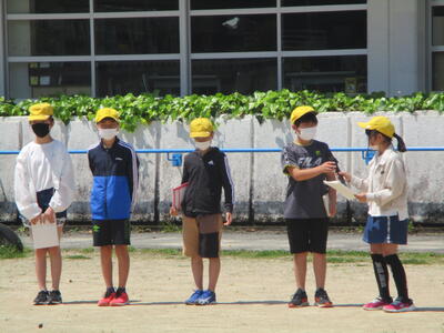 晴天の中、1年生を迎える会を運動場で行いました。運営委員会が企画し、自分たちで迎える会を進行しました。