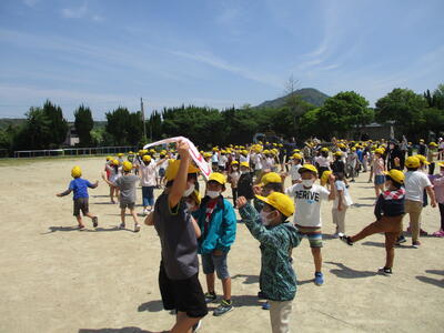 1年生を迎える会の後は、いよいよ歓迎遠足です。町民グランドでドッチボールやだるまさんがころんだやサッカーなど、先生方も一緒になって楽しく遊びました。