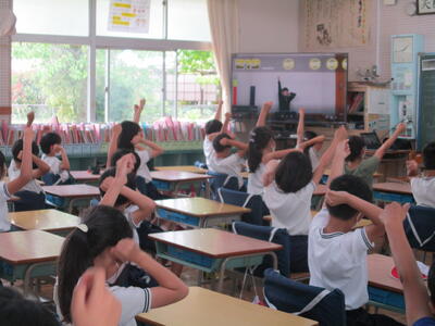 木倉小では、地震避難訓練を全校で行い、災害時の避難経路の確認を行う予定にしていましたが、雨のため、グランドへの避難は行わずに、防災頭巾をかぶって並ぶまでの訓練を行いました。その後、放送で校長先生の講話を聞き、担任の先生からの話を各学級で聞きました。命の大切さ、防災の大切さについて改めて考える1日となりました。