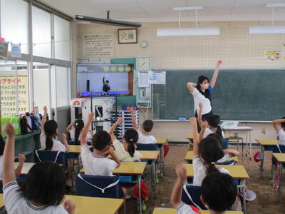 まず最初にラジオ体操を大画面の映像に合わせて各教室で行いました。久し振りにする子ども達もいましたが、徐々に思い出していました。ラジオ体操の後は毎年取り組んでいるエクササイズ動画を見ながら行うトレーニングです。今日は上半身を中心とした運動でしたが、映像に合わせ、リズムよく運動していました。終わった後は「はぁ~」という声も出ていて、いいトレーニングになりました。全校体育はエクササイズやリズムジャンプや長縄など楽しく運動することを目的に計画的に進めていきます。