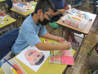 4年生の図工では「オリジナルの色をつくって似顔絵を完成させよう」に取り組んでいます。