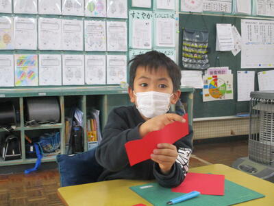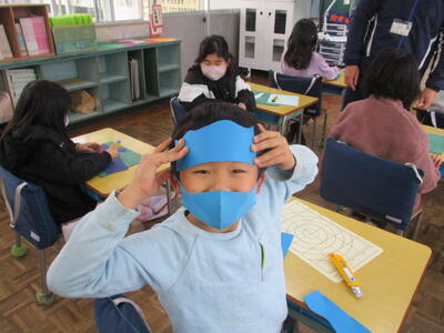 まずは、直線切り、画用紙が2つに切れると「わー」「切れました。見てください。」の声が教室中に溢れました。次は「なみなみ切り」、そして「ぎざぎざ切り」、その都度、担任の先生がポイントを指導していくと、みんな上手にきれいに切ることができました。できた色画用紙を王冠にしたり、手でなぞったり、想像力豊かな子ども達でした。