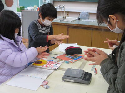 3年生の理科はものの重さの学習をしています。先生が取り出したのは直方体の木でできた積み木、縦長にして重さを量ったときと横長にして重さを量ったときでは重さは違うでしょうか?と発問しました。大人なら同じだろうと考える人が多いかもしれませんが、子どもたちは様々な意見を理由を付けて発表します。「測る面積が大きくなるから重くなる」「面積が大きくなると軽くなる」「変わらない」などの意見がたくさん出ました。そして実験、結果は「変わらない」でしたが、一所懸命に予想した子ども達は興味津々で実験を見ていました。