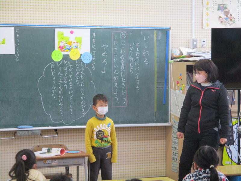 教材文を読んで、登場人物の思いに気持ちを重ねていくことで、友達がいじわるされていやな気持ちになっているときに、勇気を出して「やめろよ」ということが大切なことにみんなで気づき合っていきました。