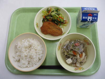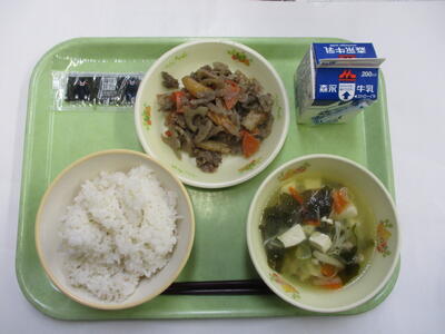 麦ごはん、牛乳、豆腐汁、馬肉と蓮根の炒め物、味付けのり